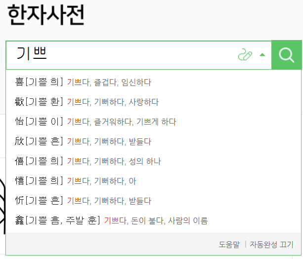 기쁘- 까지만 치더라도 이렇게 다양한 한자가 연관 검색어로 나오니