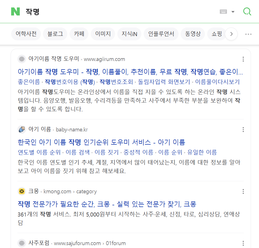 작명이라고 검색해보면 이렇게 다양한 홈페이지도 나오고,