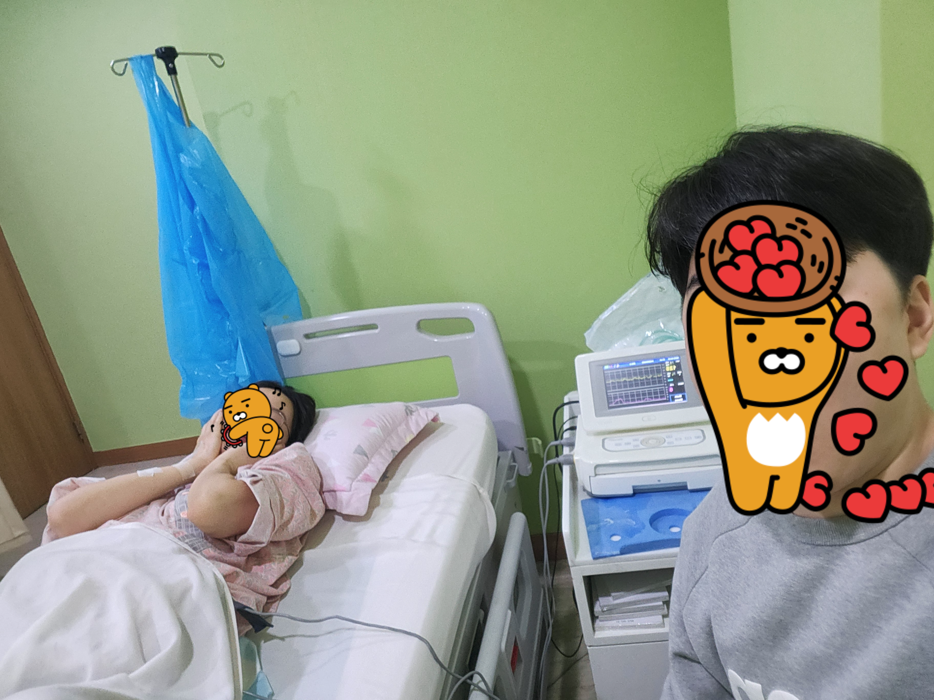 너무 아픈데 무통주사는 한 시간 뒤에 줄 수 있다고 해서 절망하고 ㅠㅠ 남편이 제 손 잡아주면서 같이 호흡하고 지지해줘서 견딜 수 있었어요.