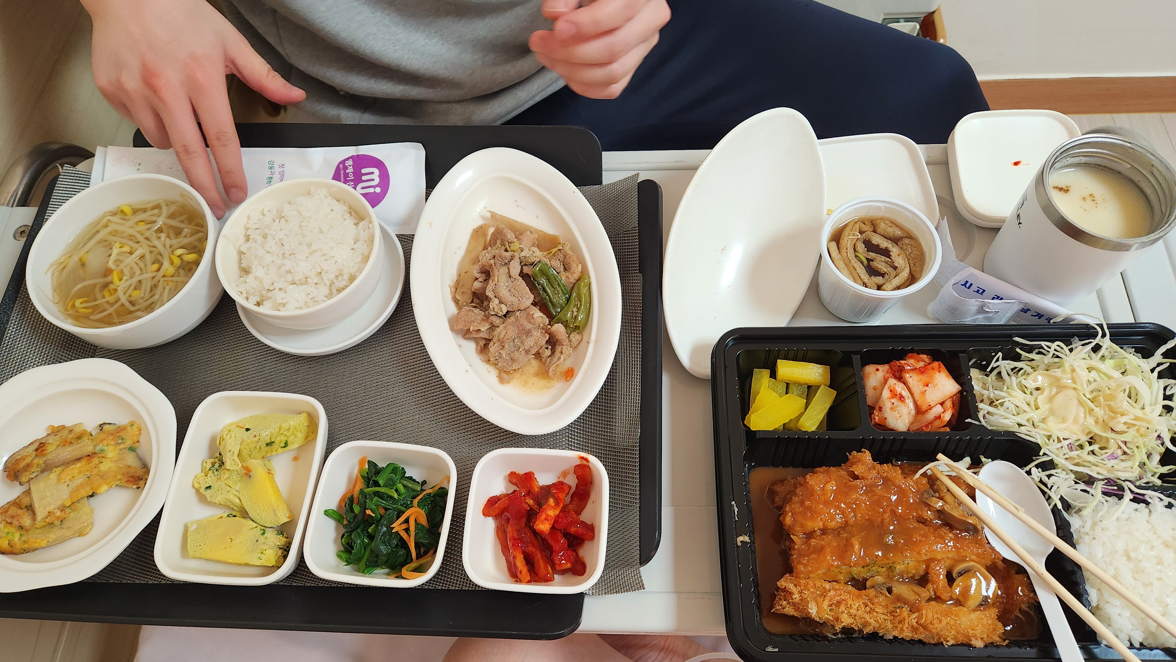 아무튼 저녁 메뉴 여쭤보고 저는 돈까스가 땡겨서 남편이 밖에서 돈까스 사왔어요 ㅎㅎ (센스있게 텀블러에 스프까지 담아 온 울 남편) 이렇게 첫날은 허무하게 끝!!